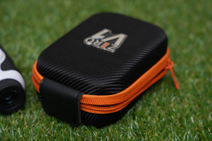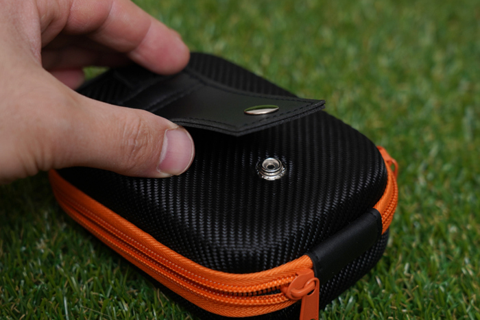 보통의 레이저 거리 측정기는 하드 케이스에 지퍼와 고무줄을 이용한 고정방식으로 구성되어있는 편이며, 지코어 그린뷰 제로 V1 모델은 끈 대신 자석 이 탑재되어 보다 편리한 사용이 가능하다.