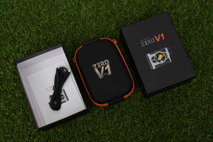 전체 구성품의 모습. 본체와 하드 케이스, 충전용 마이크로 5핀 USB 케이블이 제공된다. 전반적인 모양은 레이저 거리 측정기의 모습을 하고 있지만 GPS 기능이 탑재되어 있으며, 내장 배터리 타입으로 충전하여 사용할 수 있다.