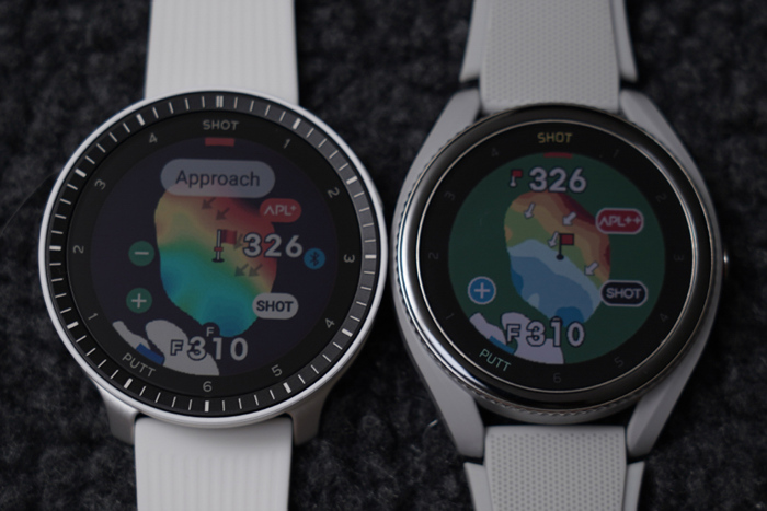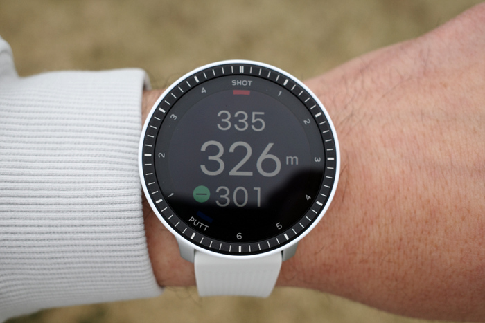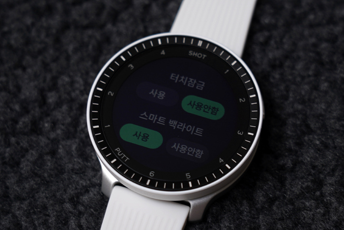 베젤 안쪽에는 1~6 SHOT과 1~4 PUTT표기로 샷 트래킹 기능과 연동한 현재 샷/퍼팅 상황을 확인할 수 있다.