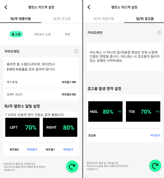 또한 KPGA와 KLPGA 프로들의 스윙 시 체중 이동 과 비교 분석이 가능하여 혼자서도 연습장에서 편리하게 연습할 수 있어 만족스러운 제품이다.