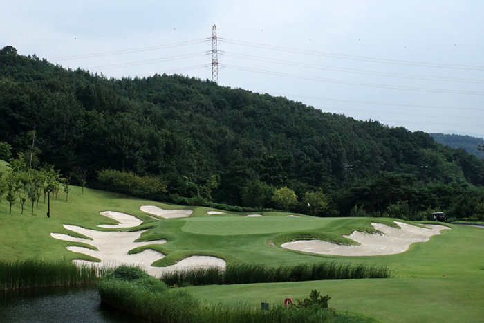힐 코스 4번홀은 우측으로 굽어진 292m 파4. 세컨샷 이후 지점부터 좌측에 큼직한 해저드와 벙커가 있어 오른쪽으로 공략하는 것이 좋다.