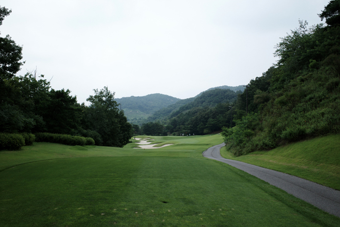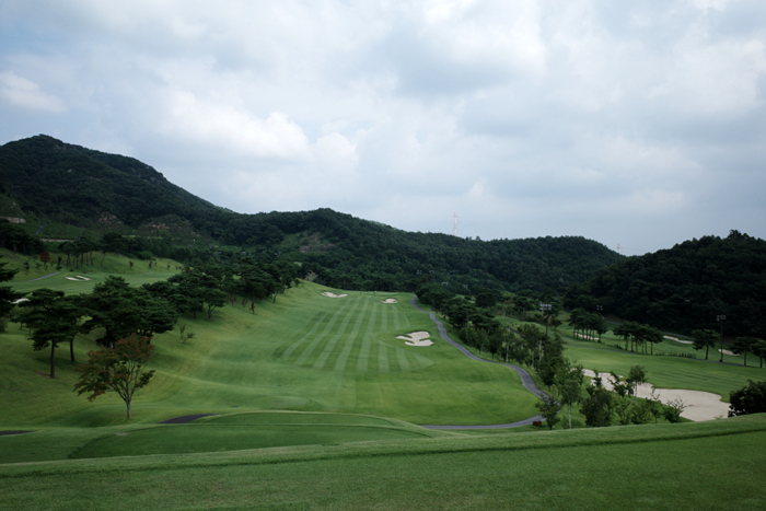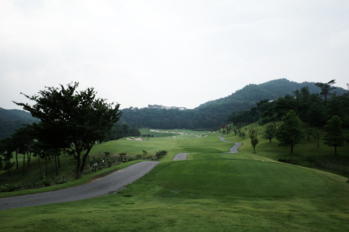 힐 코스 1번홀은 346m 파4. 오른쪽으로 약간 굽어진 곳으로 낙구 지점 근처의 벙커를 주의해 왼쪽으로 공략해야 세컨샷이 편안하다.