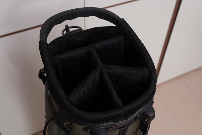 추가적으로 대부분의 경량 캐디백에 적용되어있는 얇고 흐물거리는 후드(커버)가 아닌 두껍고 빳빳한 소재로 클럽에 커버를 모두 씌운 상태에서도 여유있게 수납할 수 있어 편리하다.