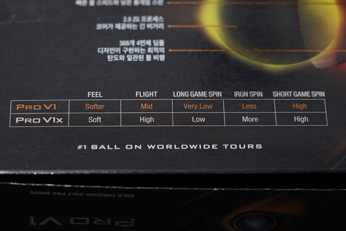 패키지에 제품 특징이 표기되어있다. PRO V1 모델은 3피스, PRO V1X 모델은 4피스 구성이며, 가격은 비슷하다. 한더즌에 6만원대로 공 하나의 가격이 5천원에 달한다. 3피스 우레탄 커버 제품 중 가장 저렴한 코스트코 시그니처 모델이 비해 3배정도 비싼 가격.