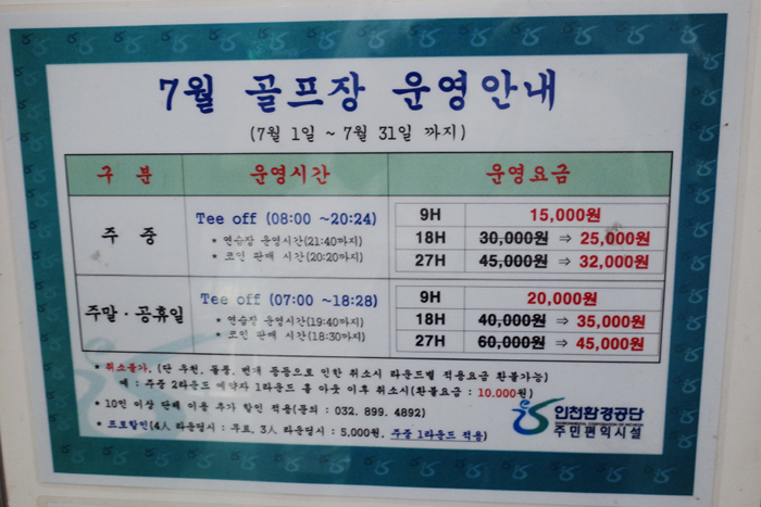 2019년 7월의 주말에 방문했는데, 평일 9홀 15,000원, 18홀 25,000원이며, 주말은 9홀 20,000원, 18홀 35,000원으로 매우 저렴하다. 2020년 7월에도 홈페이지에서 동일한 가격으로 운영됨을 확인할 수 있다.