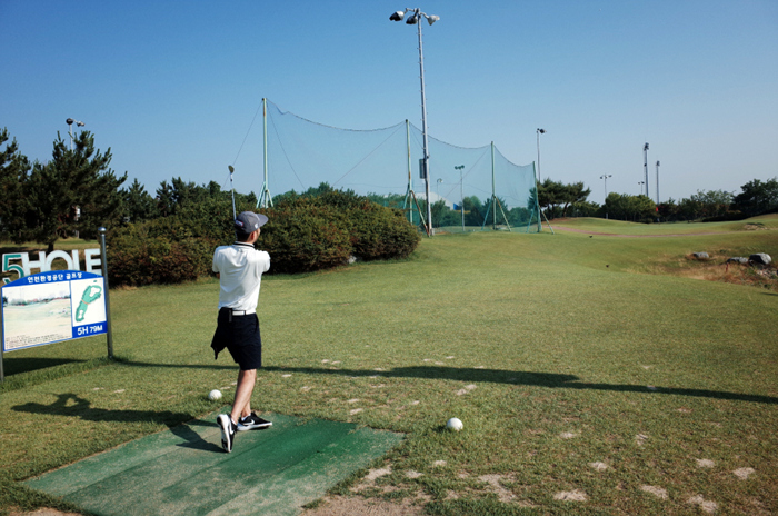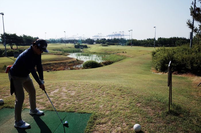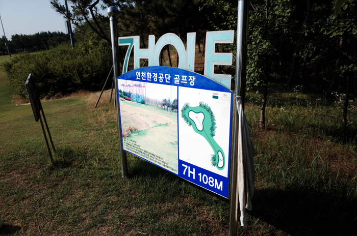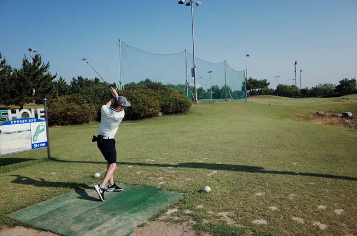 인천환경공단 송도스포츠파크 파3 골프장의 가장 긴 홀인 108M의 7번홀, 티샷 중인 매실킹의 모습.