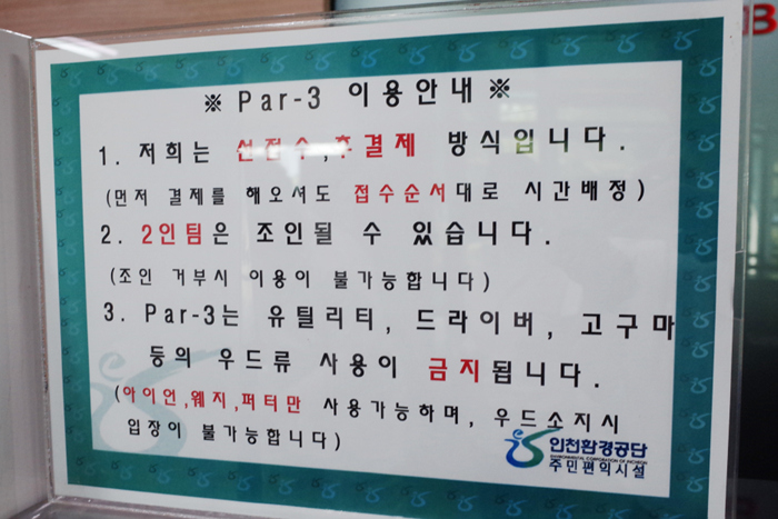 인천환경공단 송도스포츠파크 파3 골프장은 주말에도 매우 저렴하게 이용할 수 있는 것이 가장 큰 장점으로, 깔끔한 코스와 그린 관리로 매우 만족스러운 곳이다. 사전 예약이 불가능하고 현장에서 접수하는 시스템의 특성상 시즌 중에는 대기 시간이 다소 소요될 수 있다는 점이 유일한 아쉬운점이었다.