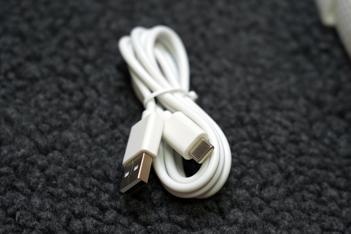 심플한 구성품에 제품 본체에 직접 케이블을 꽂는 USB TYPE-C 충전 타입. 제품 색상은 화이트와 블랙 중 선택할 수 있다.