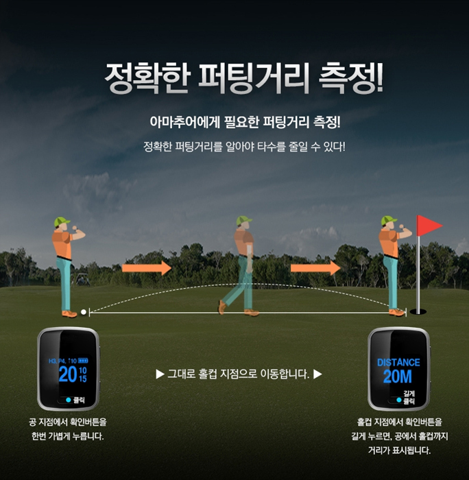 그린에서는 볼과 홀컵과의 거리를 측정할 수 있는 기능이 유용함을 더해준다. 긴 퍼팅이라면 발걸음으로 언듈레이션을 파악하면서 거리를 측정해 컨시드를 노리는데 도움이 된다.