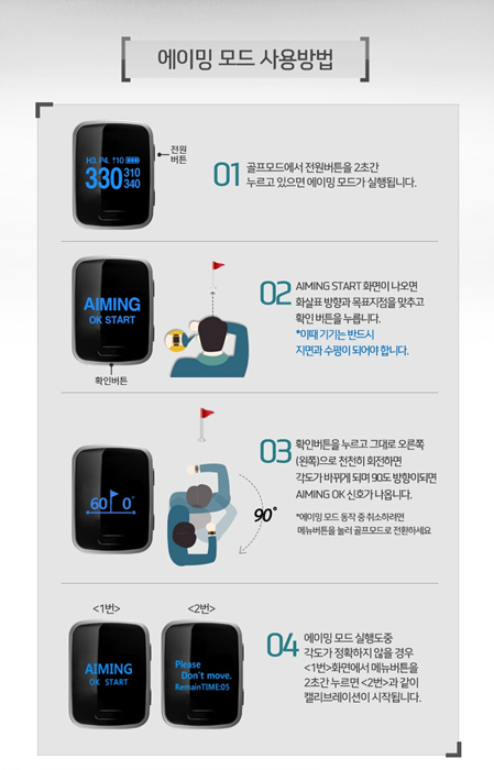 에이밍을 도와주는 유용한 기능이 제공된다. 타겟을 향해 버튼을 누르고 90도 돌려 어드레스를 잡으면 각도가 바뀐다. 에이밍이 일정치 않은 초보자들이라면 유용한 기능이다.
