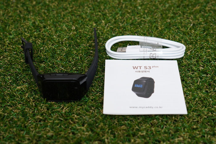 전체 구성품의 모습. 시계형 본체와 사용 설명서 및 충전용 마이크로 USB 5핀 케이블로 구성되어있다.