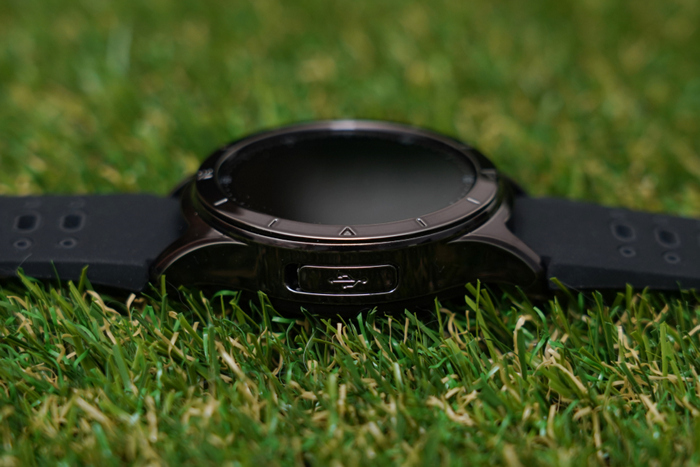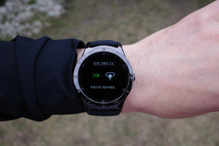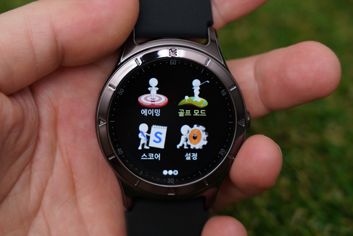 블랙 컬러를 기본으로 화면 테두리에 골드 링이 포인트로 더해져있다. 호불호가 있을 수 있겠지만 스마트폰과의 연동을 통해 전화나 문자, 카톡 등의 알림을 확인할 수 있어 라운드 중이 아닌 평상 시에도 활용할 수 있는 부분이 있지만 튀는 색상으로 인해 다소 부담스럽다.