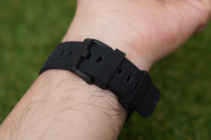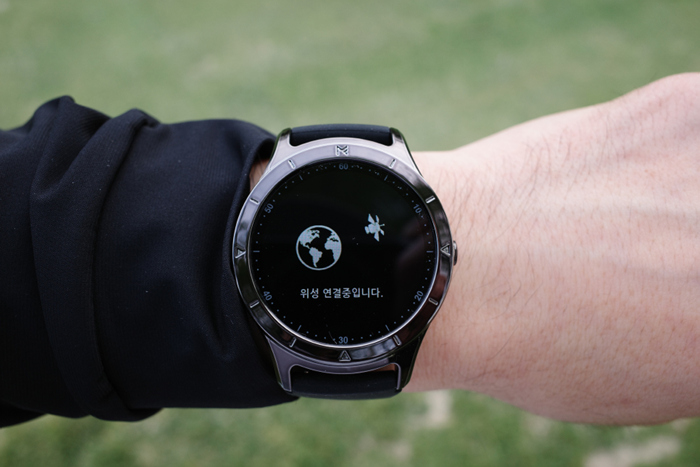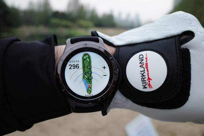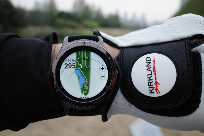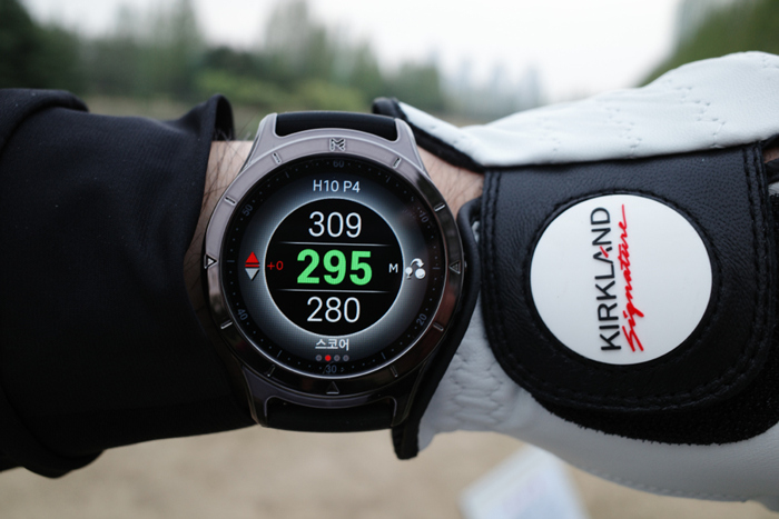 손목에 착용해본 모습. 스트랩이 내부로 수납되는 구조로 덜렁거림 없이 편안하게 필드 라운드가 가능하다.