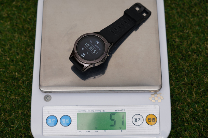 스트랩을 장착한 본체의 무게는 57g으로 보이스캐디 T8 모델에 비해서는 약 9g 무거우며 크게 부담스러운 수준은 아니다.