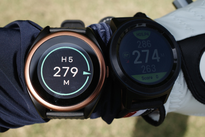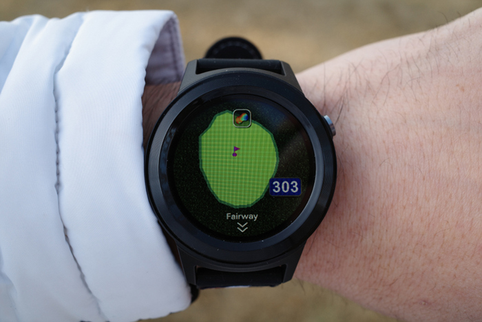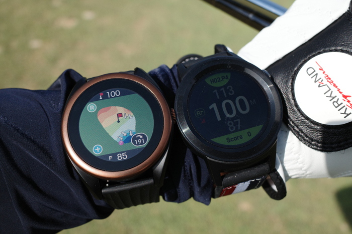 레이저 측정기와 달리 전체 코스뷰는 물론 해저나 벙커까지의 거리 등을 한눈에 확인할 수 있는 GPS 워치형 골프거리측정기는 코스 매니지먼트에 도움을 준다. 스마트핀 기능으로 화면상에 표시된 핀 위치와 실제 핀 위치가 동일한 것을 확인할 수 있다.