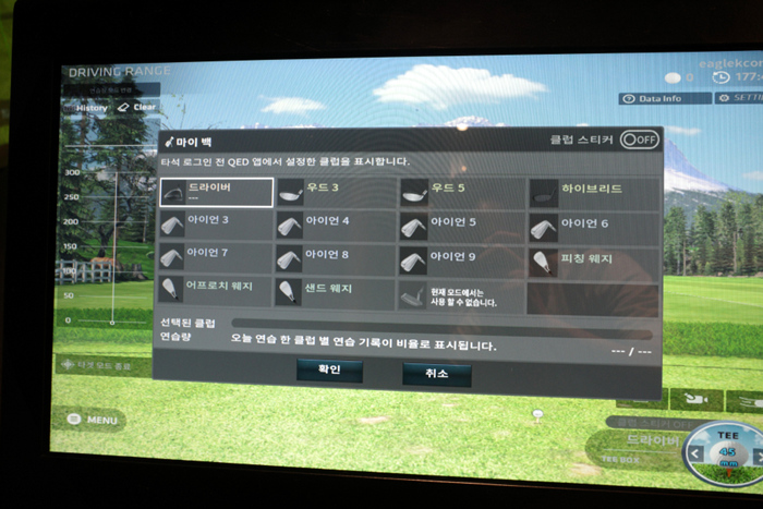 QED 인터페이스의 모습. 드라이빙 레인지와 스크린 골프 플레이와 같은 모드까지 다양한 모드가 있으며, 클럽을 선택해 데이터를 기록할 수 있다.