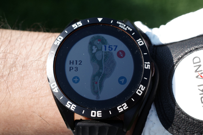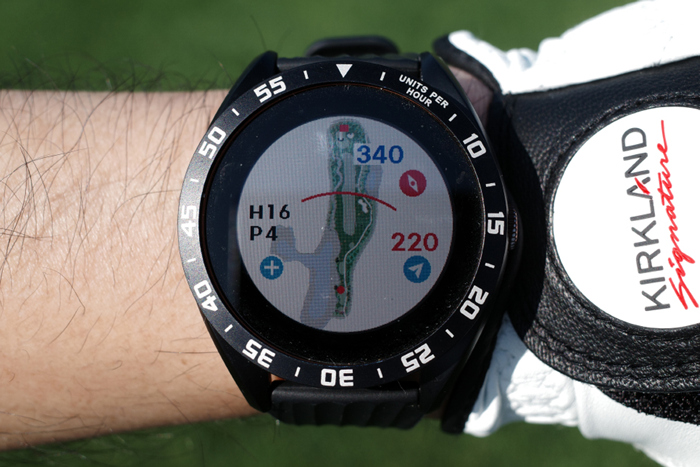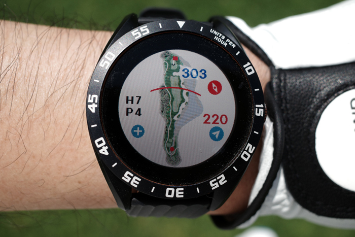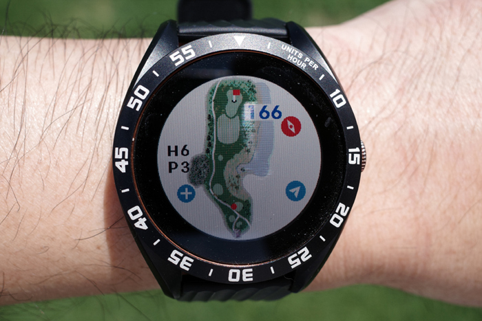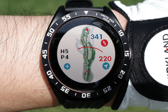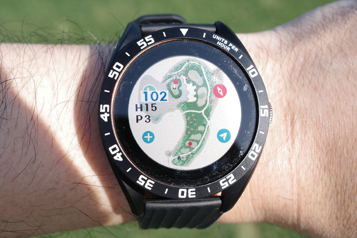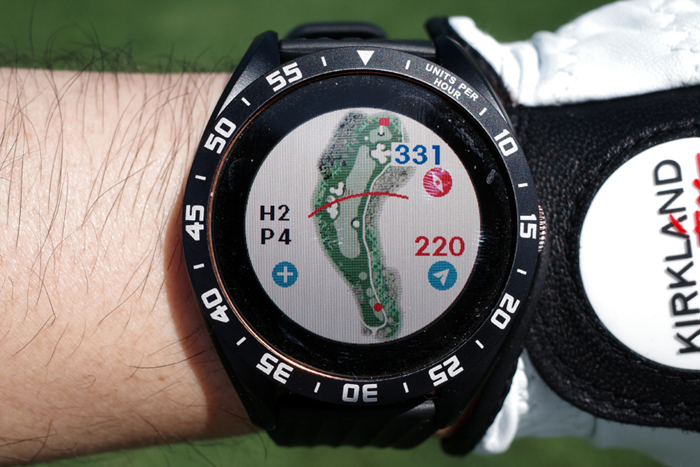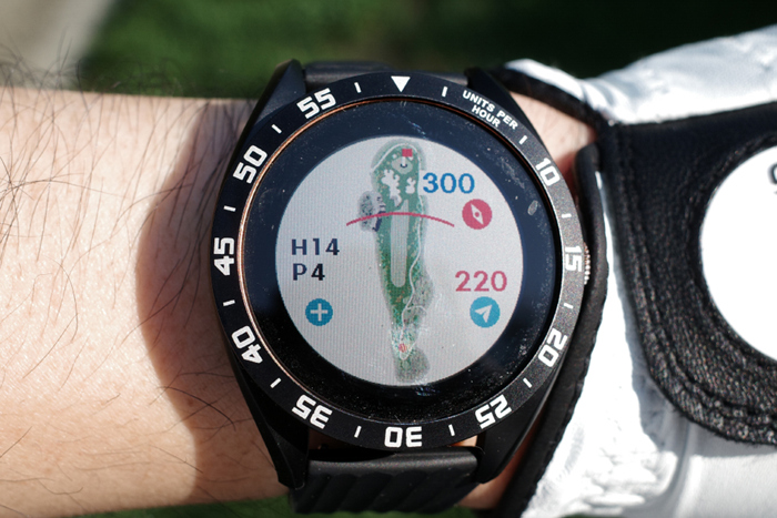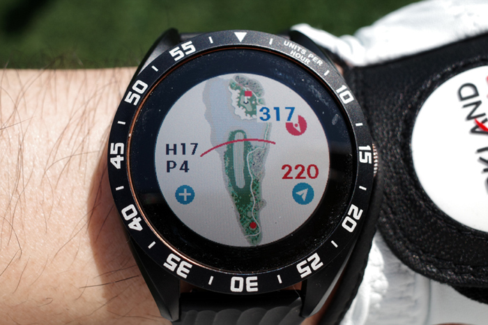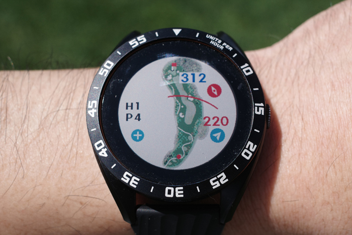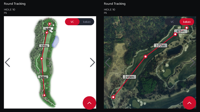 GPS 골프 거리측정기인 보이스캐디 T8로 자동 기록된 플레이 데이터. 내리막이라 약 250m 정도로 드라이버 티샷을 보내고 아이언으로 그린 주변까지 공략, 짧은 어프로치로 홀컵에 붙여 원퍼팅. 버디를 기록했다.