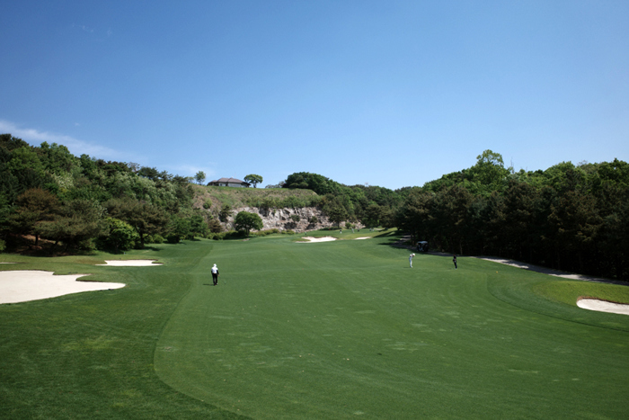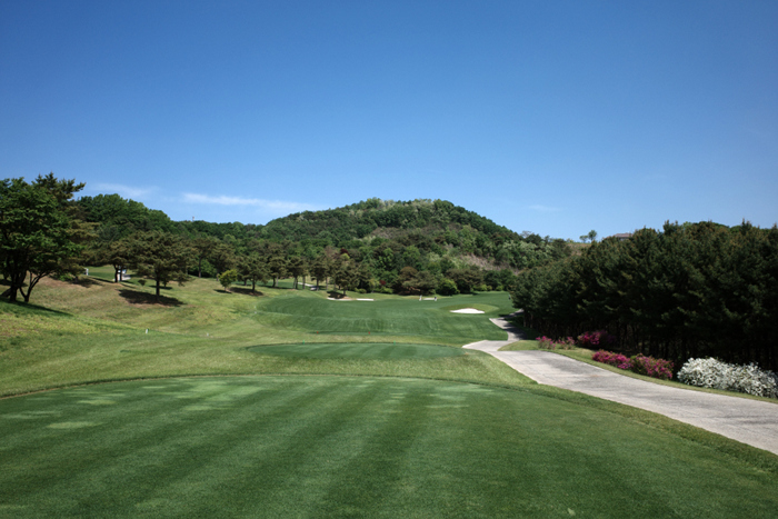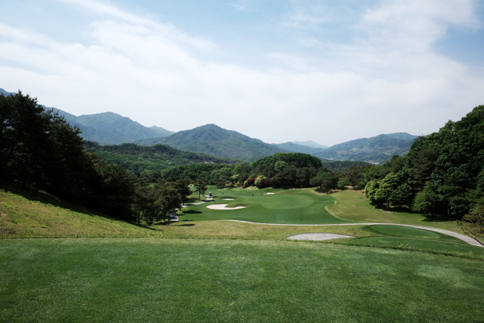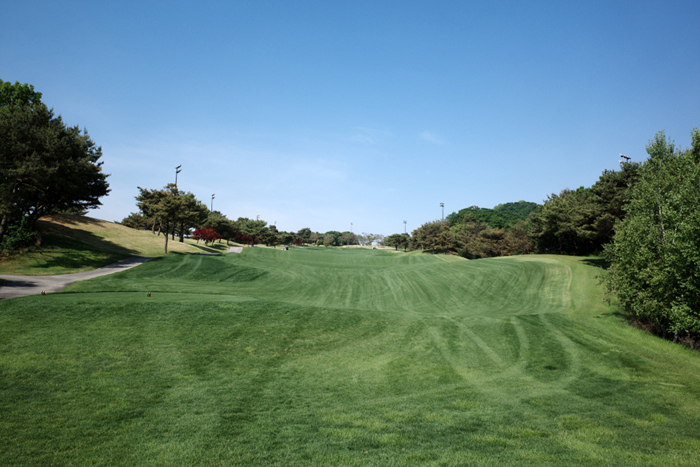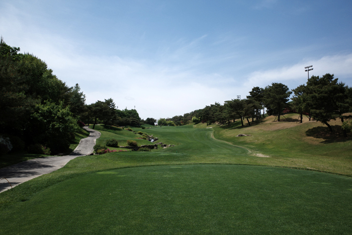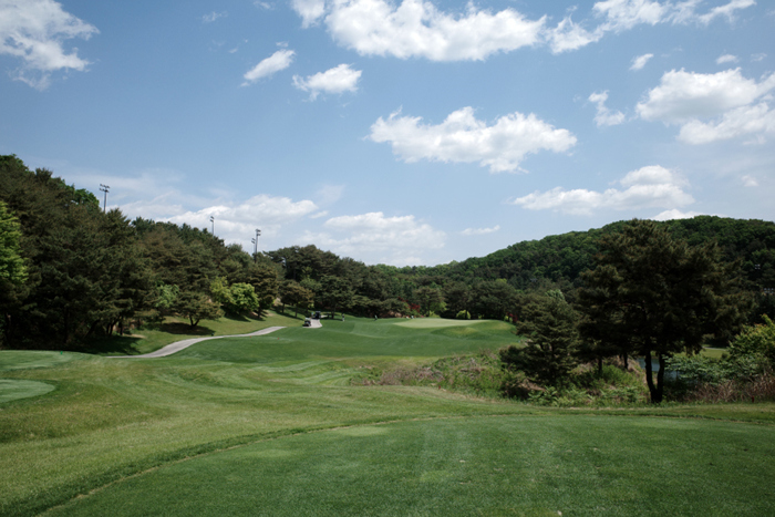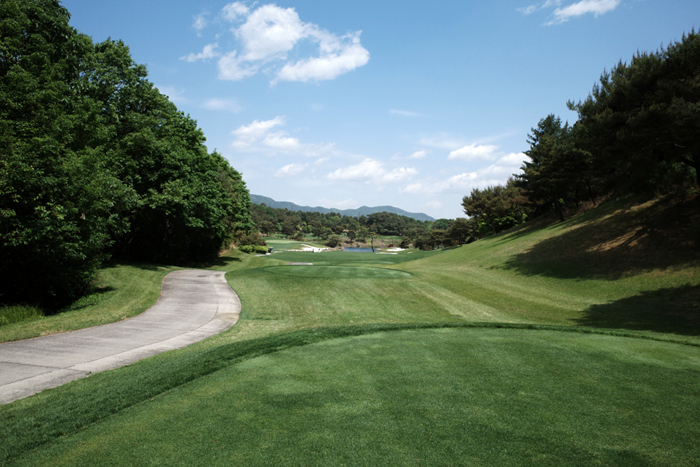 그늘집에서 내려다보이던 홀이 바로 이 곳. 오르막으로 구성되어있으며 짙은 초록색의 잔디와 파란 하늘이 아름답게 잘 어우러진다.