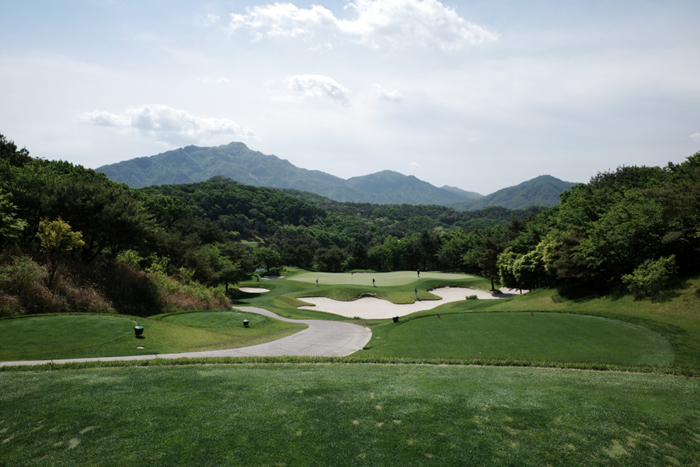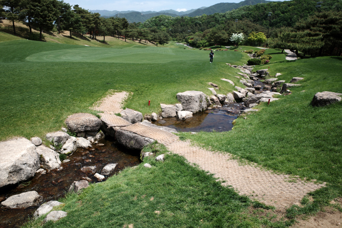 크리크 코스 13번홀은 331m 파4. 드라이버 낙구지점인 220m 페어웨이 중앙에 벙커가 있어 드라이빙 아이언으로 끊어 공략했다.