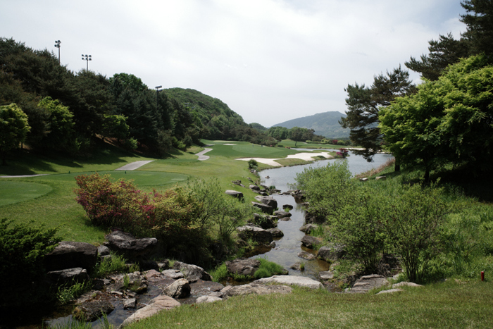 크리크코스 마지막 9번홀은 324m 파4. 좌측에 개울이 흐르고 있는 구성으로 오른쪽으로 공략하는 것이 좋다.