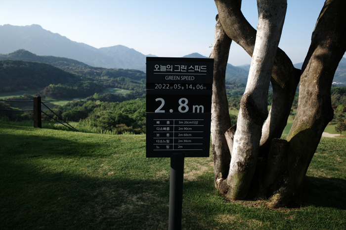 연습 그린 옆에는 오늘의 클럽 스피드가 표기되어있다. 2.8이면 일반적인 퍼블릭 골프장의 그린스피드에 비해 다소 빠른편이다.