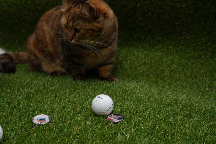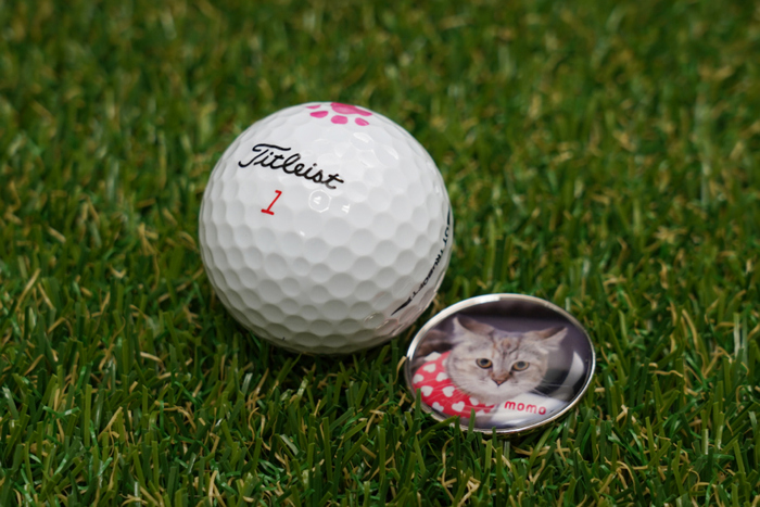 자신의 사진이 들어간 볼마커와 골프공을 만져보고 살펴보는 모모와 아로.