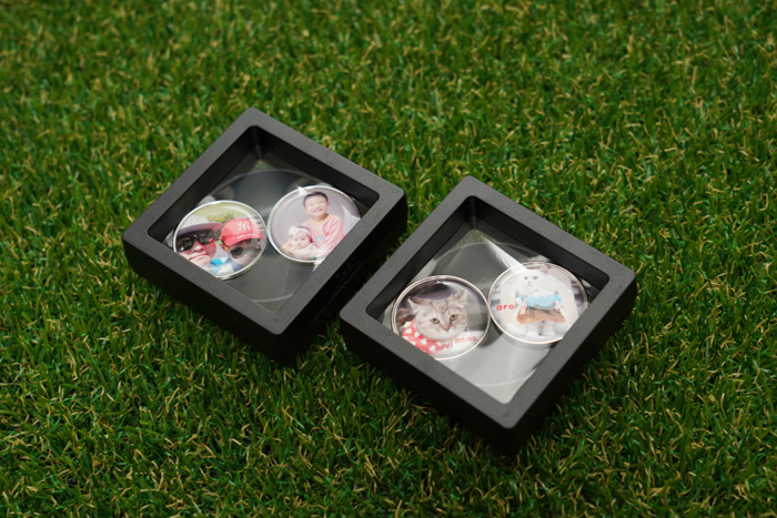 500원짜리 동전보다 약간 큰 사이즈로 제작되어있으며, 선명하게 인화된 사진 위에 투명 코팅이 더해져 스크래치나 손상될 우려가 적다. 주문할때 사진 외에도 원하는 글자를 추가하거나 디자인도 의뢰할 수 있어 더욱 다양한 포인트를 더할 수 있다.