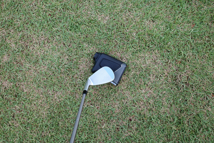 측면 자석 기능인 BITE를 활용해 아이언에 부착한 모습. 거리 측정 후 바닥에 내려놓았다가 다시 들어올릴때 허리를 숙이지 않고도 클럽에 부착해 편리하게 활용할 수 있다.