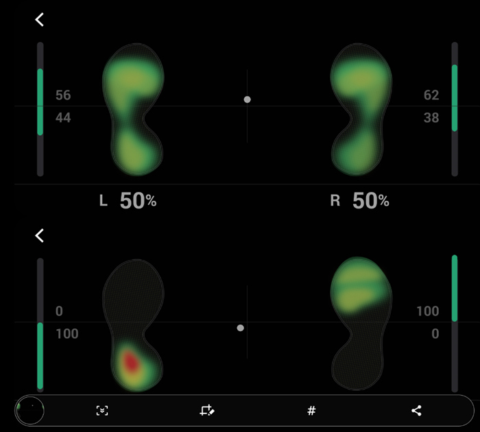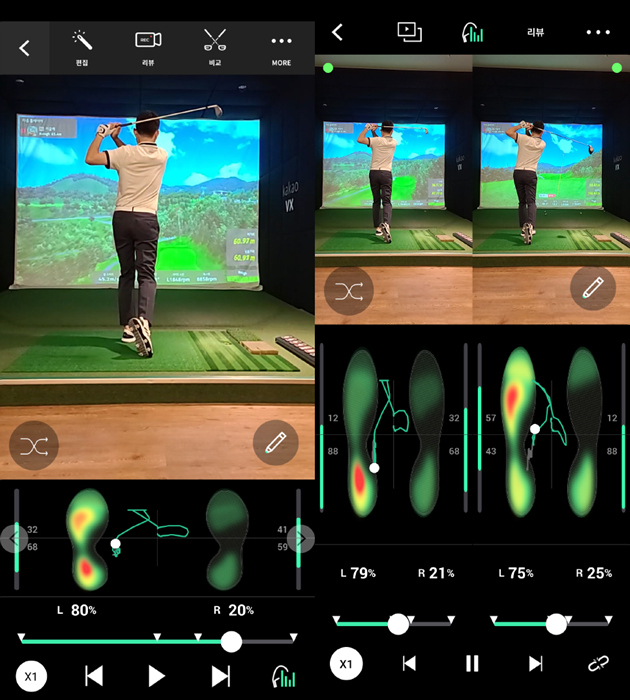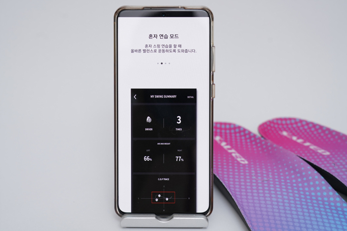 체중이 이동함에 따라 양쪽의 발바닥 모양에 녹색-노란색-빨간색으로 색깔이 직관적으로 표시되며, 전체 압력 중심의 이동이 선으로 표시되어 직관적으로 확인할 수 있다. 체중 이동에 따른 스윙과 그에 따른 구질의 교정까지 가능하다.