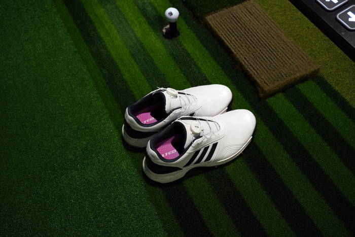 골프화에 솔티드 스마트 인솔을 착용하고 스크린 골프장에서 연습하며 사용해보았다. 양쪽에 4개의 얍력 감지 센서가 탑재되어 좌/우의 이동 뿐만 아니라 발끝과 발꿈치까지 분산되는 체중을 실시간으로 확인할 수 있다.