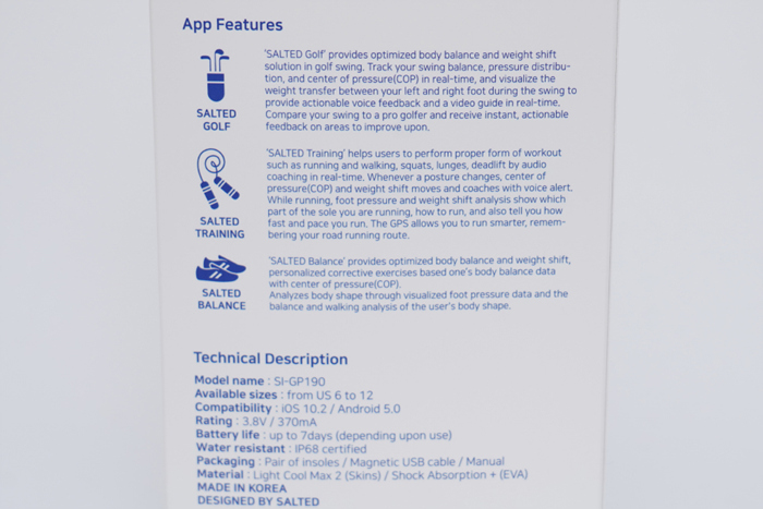 4개의 압력 센서가 내장되어 골프 뿐만 아니라 바른 자세 교정, 보행 및 런닝의 분석이 가능하다. 아이폰과 안드로이드 스마트폰을 모두 지원하며, 완전 충전 시 최대 7일의 사용이 가능하다. 운동 중 발에 땀이 차거나 비를 맞는 경우도 있기에 필수적인 방수 등급은 IP68로 안심하고 사용할 수 있다.