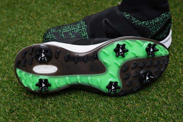 후면과 바닥면까지 그린 컬러 포인트가 가득 담겨있으며, 바닥에는 6개의 스파이크가 장착되어있다. 스파이크리스 제품에 비해 습기에 강해 악천후의 야외에서도 미끄러짐 없이 안정적으로 사용할 수 있다.