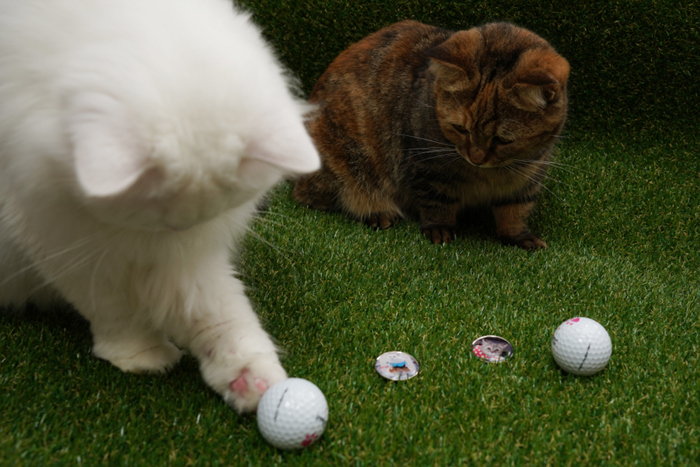 자신의 사진이 들어간 볼마커와 골프공을 만져보고 살펴보는 모모와 아로.
