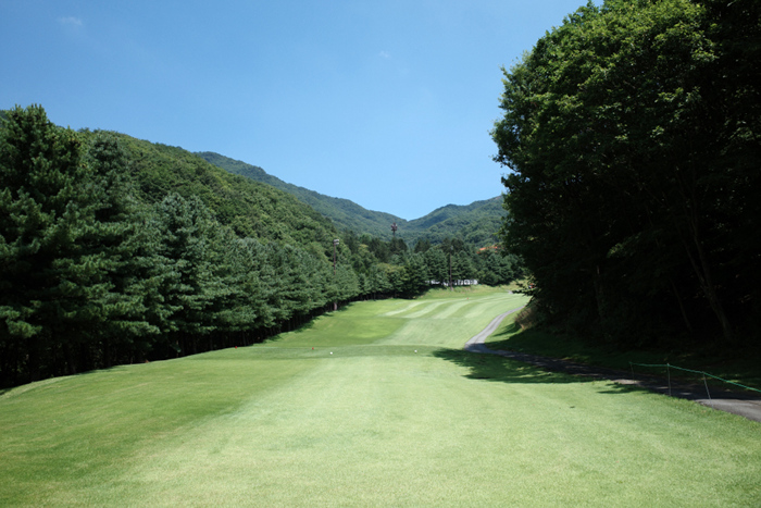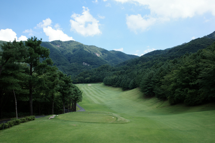 팔공CC 후반 라운드는 인 코스로 315m 파4의 1번홀을 확인할 수 있다.
