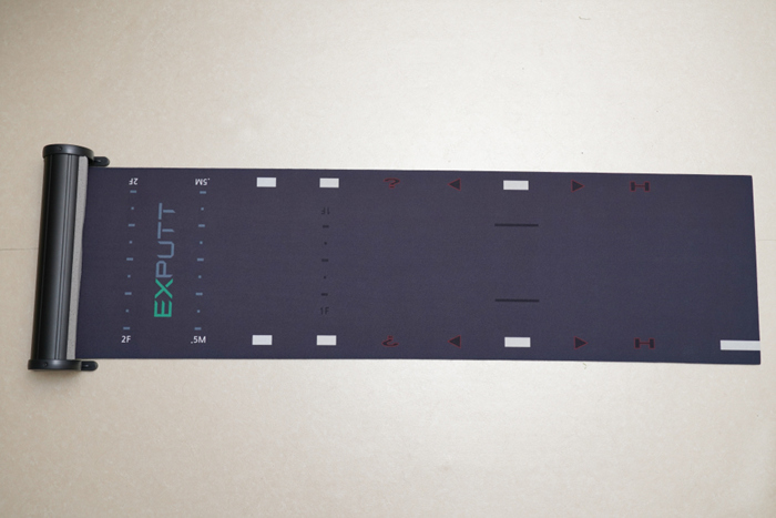 극세사 느낌의 매우 부드러운 매트는 골프공이 굴러가도 소음이 없이 조용하다. 긴 길이에 거리감을 연습할 수 있도록 50cm 단위로 표기가 되어있다.