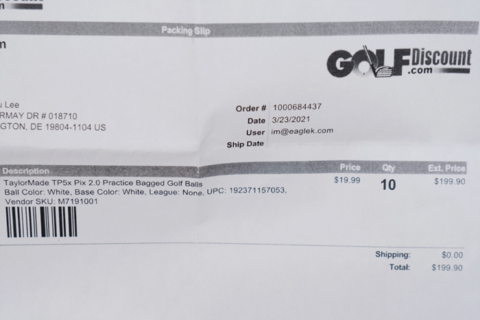 관세 면제 한도에 맞춰 12개 1더즌 구성을 총 10세트로 120개의 볼을 구매했다. 해외 배대지 비용은 약 30달러로 총 비용은 한화로 약 256,000원이 소요되었다. 개당 2,100원대의 가격에 3피스도 아닌 무려 5피스의 새볼을 구매할 수 있어 매우 탁월한 가성비라고 할 수 있다. 정상 제품에 비하면 절반정도의 가격이다.