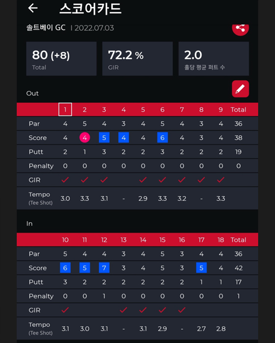첫 싱글 스코어는 2022년 7월 3일, 경기도 시흥의 솔트베이CC에서 달성했으며, 한타 차이로 70대 스코어는 기록하지 못해 아쉬움이 남았다. 이후 두 번 모두 81, 80타로 아직까지 70대 싱글 스코어는 기록하지 못했다.